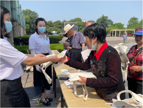 在润州广场,工作人员向市民宣传生物多样性知识,发放宣传册。
