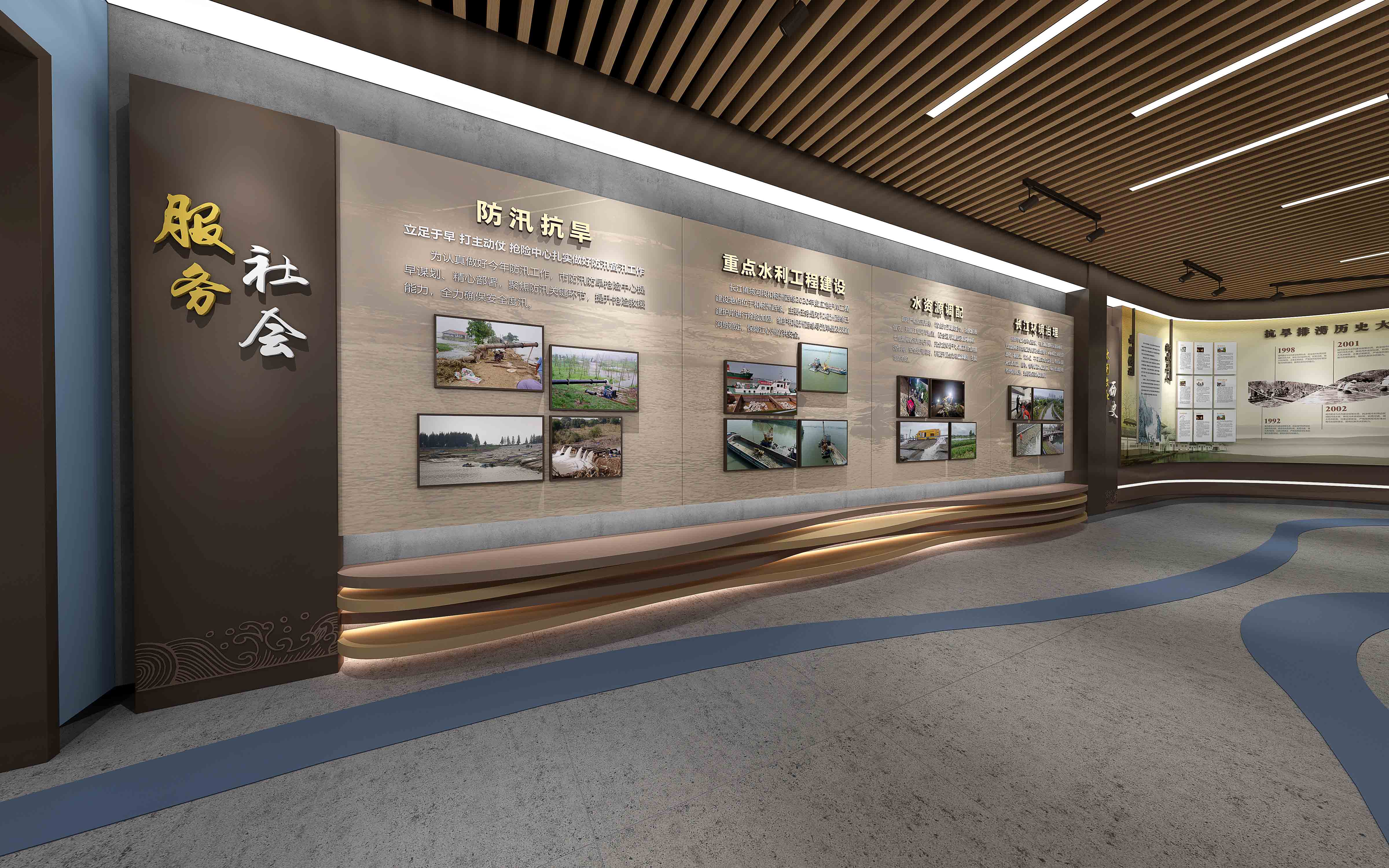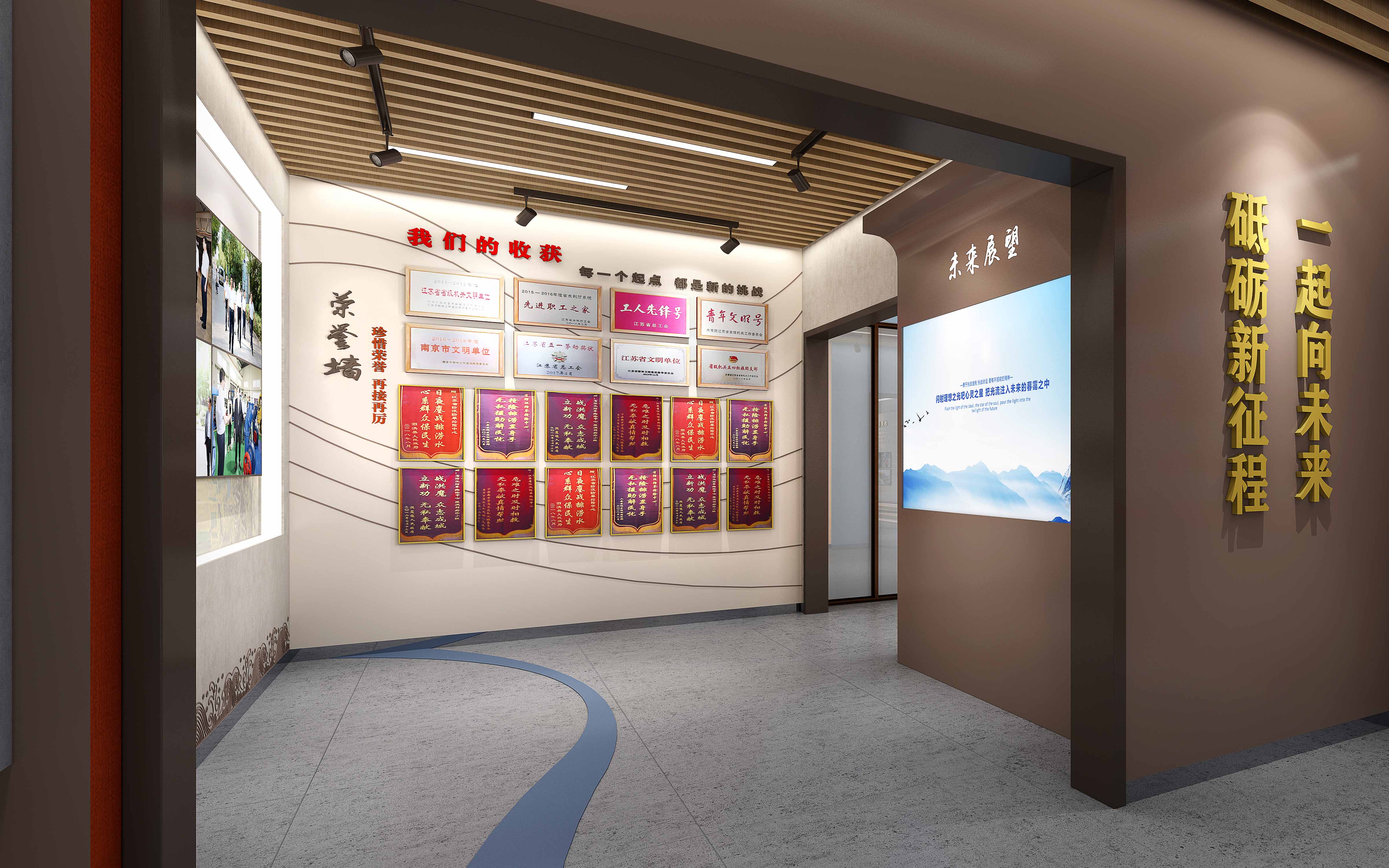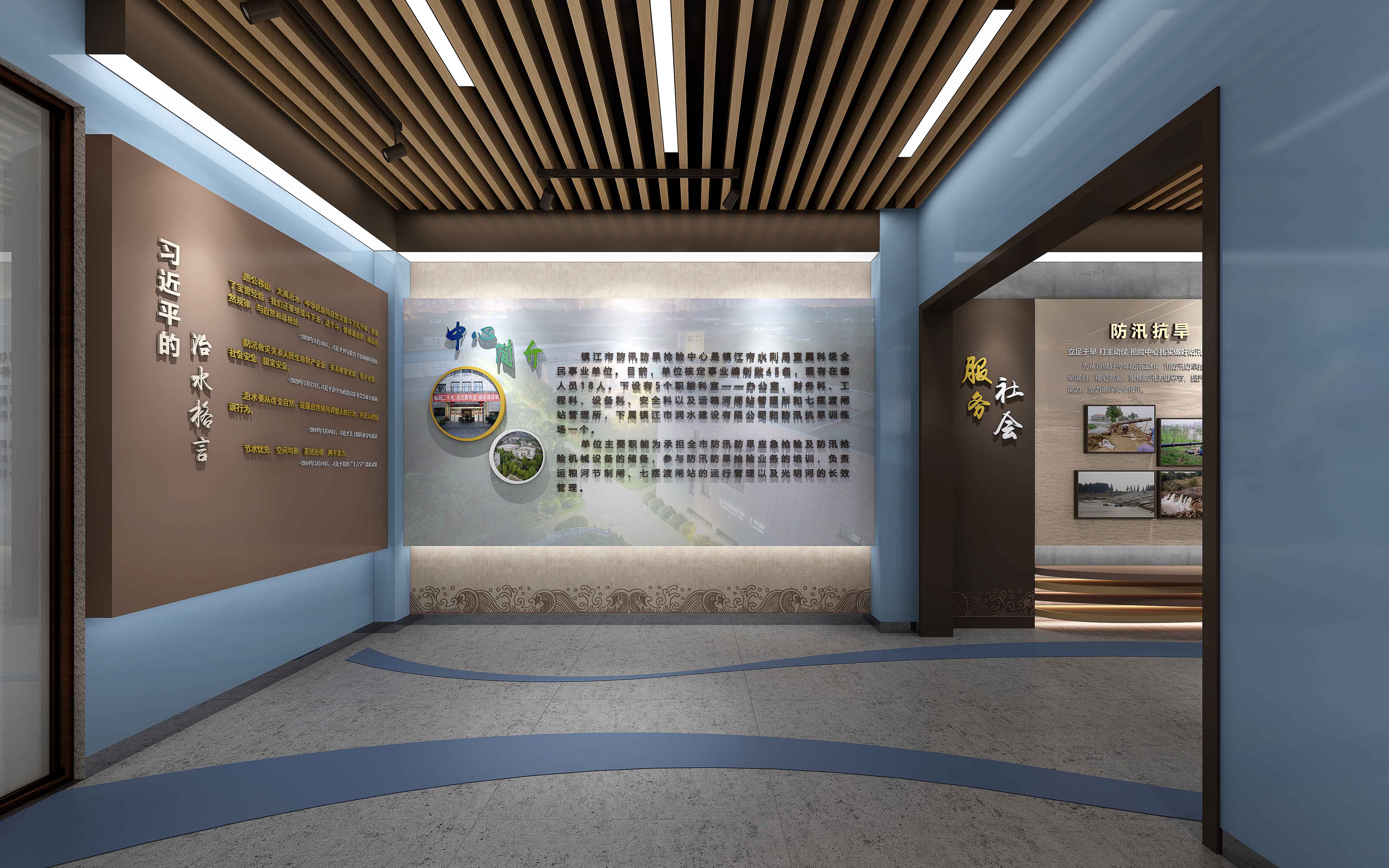 由江苏领先设计施工的“安澜馆” 既具创新思维、又有历史文化底蕴,是江苏领先全力打造的又一新作。设计团队以现代简约的形式围绕“治水、管水、兴水”这一主线,通过声光电和实物展示的形式,从党建引领、为民服务、科技兴水、运粮河历史文化、领导关怀、荣誉展示等方面展示了镇江市防汛抢险人在长江和大运河交汇处,60年薪火相传,为保护镇江古城安澜,在防汛抢险事业第一线无私奉献聪明才智和青春年华的光辉历程。