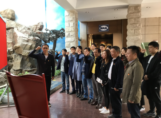 第一站,全体党员来到茅山新四军纪念馆,在红色革命教育基地,面对鲜红的党旗,同志们举起右拳,庄严地重温入党誓词,不忘入党初心,铭记入党誓词,立志为共产主义奋斗终身。党员同志们铿锵有力的宣誓声,久久激荡在宣誓大厅。