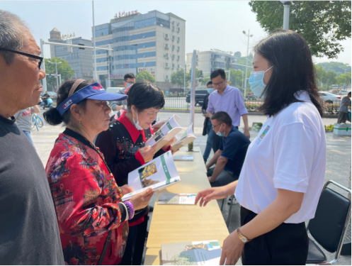 在润州广场,工作人员向市民宣传生物多样性知识,发放宣传册。