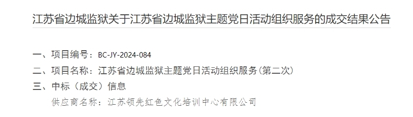 近日,江苏领先凭借科学的培训方案、高水平的培训师资配备、完善的培训服务措施和党员培训行业中的良好口碑,成功中标江苏省边城监狱主题党日活动组织服务采购项目。